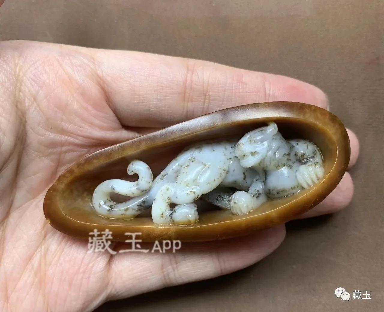 I saw this on one of the jade carving forums I belong to in China. The craftsman concerned bought a cobble of Hetian jade with a thick orange rind. There was no window cut into the stone but after using a strong flashlight he believed the flesh inside was pure white. He took a gamble and bought it but when he cut it open he found the white was marred with black spots. Still a nice stone but far less valuable than if it had been pure white jade. He got round the problem by carving a leopard like creature inside the rind. It is a great carving and shows the marvellous creativity that can go into fashioning a thing of beauty from jade. They say a true master can see the design within the stone before he starts work on it. This may be true but I also go along with the old English saying, ‘necessity is the mother of invention’, Learn more at www.jadefiend.com