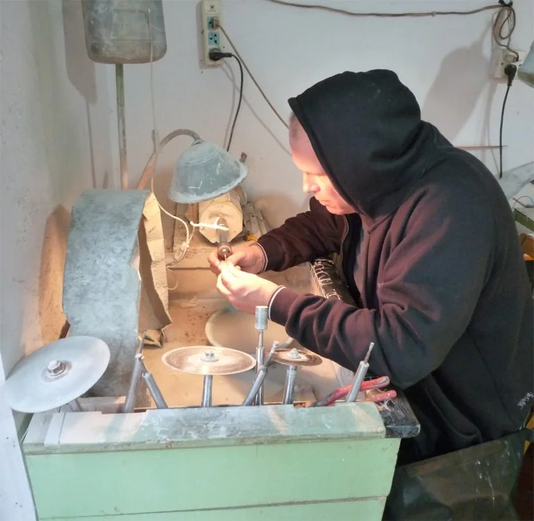 Bangle carving is done on an industrial scale in China. Once they have been carved, they need sanding and polishing. This woman’s job is to sit at her work station every day and sand bangles. It’s a tough job.