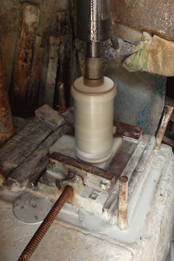Once the slab has been trimmed into a roughly even shape it is then placed back in the drill press and the two core drills are used again. One of the reasons for doing it this way is that the more even shape of the trimmed slab, the easier it is to wedge the jade into place. This time the core drills cut deeper into the stone. They stop cutting only millimetres short of shearing completely through to the metal plate on which it rests.