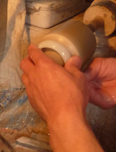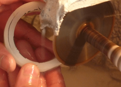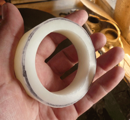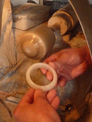 Sanding the outside of the bangle. The bangle is pushed onto this special wood and rubber drum which spins at 1000+rpm. The bangle is stopped from flying off the drum as it spins by pushing 240 grit sanding sticks against the jade from above and below This process further smooths and shapes the bangle. The same process is repeated with 325 grit sanding sticks. During this operation the bangle must be constantly measured to make sure it keeps an even shape.