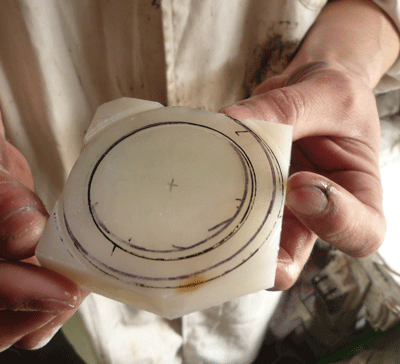 Once the slab had been cut from the larger boulder I made a minute examination of it to make sure the jade was good enough to make a bangle of the highest quality. I needed to check that I could fashion a bangle without using any of the brown rind or skin of the stone. After using a set square and ruler I believed that the white flesh of the stone was just large enough.