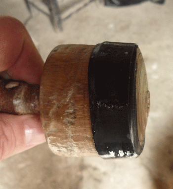 Sanding the Rim. A different wooden drum is used to sand the rim of the bangle (fig 1). This drum is spun at high speed while the bangle is pushed against it. Both inner rims of the bangle are smoothed in this way. It takes some strength to hold the bangle steady (fig 2). If it flies off and chips the whole process might have to begin again.