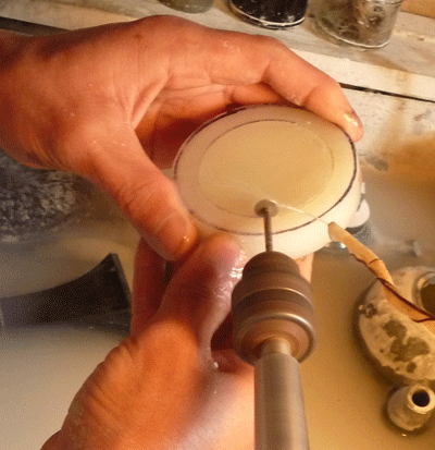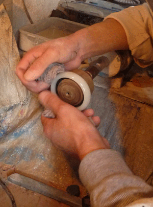 The final polish. A well worn hard felt bob is attached to the carving point. A very diluted diamond polishing powder is sparingly applied to the bob and to the bangle. The same felt bob is used to polish the inside, outside and rim of the bangle. The felt bob should spin at a fast enough speed to make the bangle uncomfortably hot to touch.