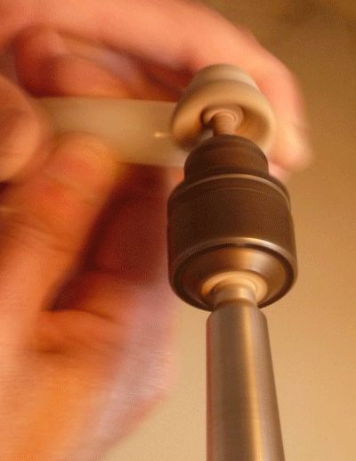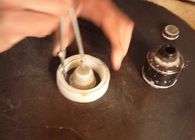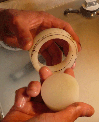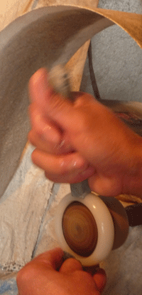Yet another special drum is used for sanding the inside of the bangle. The same method is used as before with the drum spinning on a carving point. This time the jade is pushed into the drum to hold it steady . Sanding sticks of 240 and 325 grit are used to smooth and shape the inside.