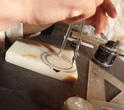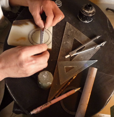 Curvature. The next stage involves putting a curved surface on the bangle. First a circular line is inked onto the jade . Then the small saw is again used to slice off slivers of jade following the line that has been inked on to the stone. Then the jade is examined to make sure the shape is still even. Precise measurements are taken. This process is repeated two or three times. Each time the shape of the bangle is subtly changed. It slowly takes on a rough but even curved shape.