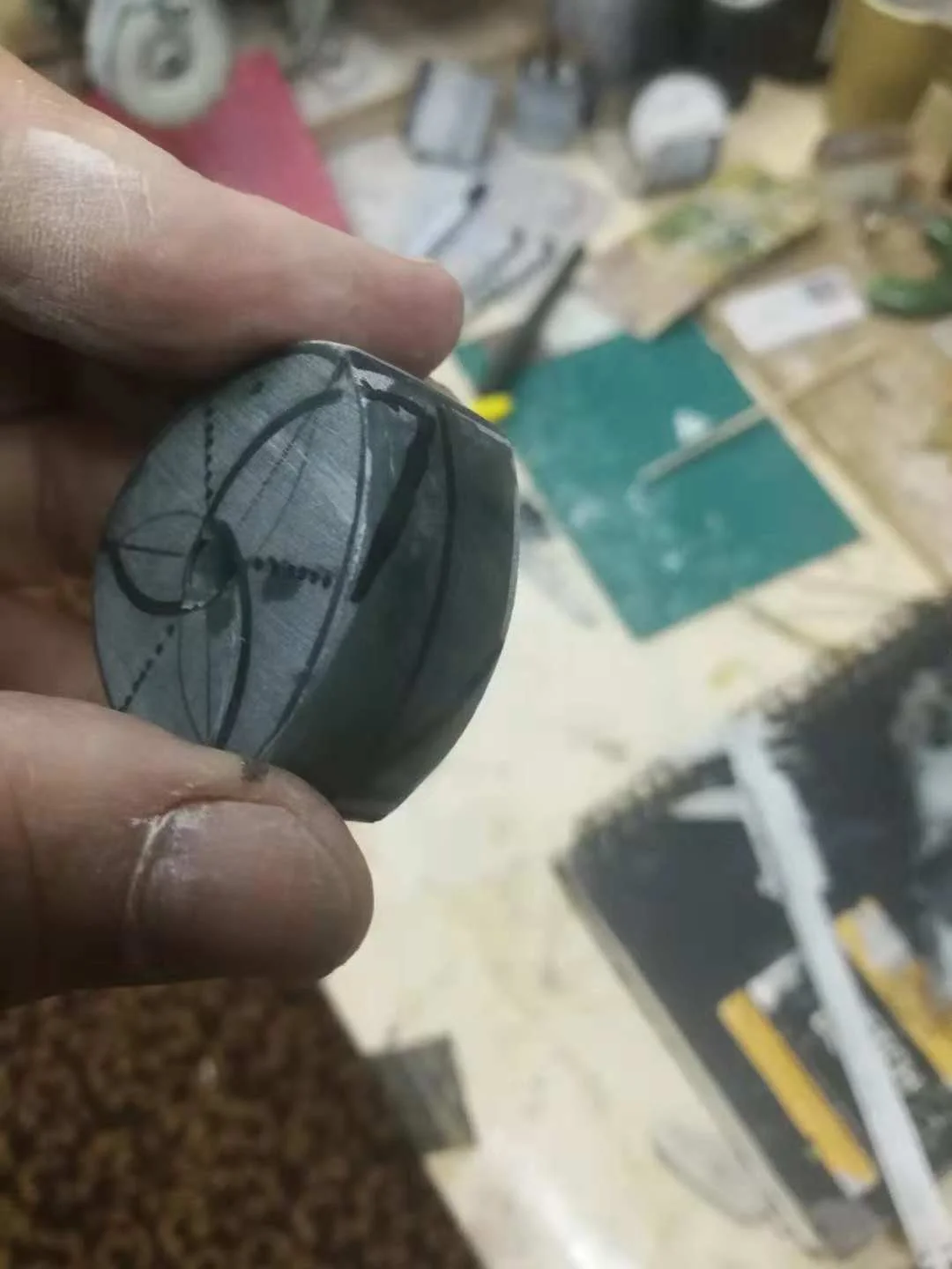 When the template is ready I then place it on the piece of jade I am going to carve the Mobius from. Using a waterproof marker pen I then draw round the template on the jade itself. I rotate the template three times and draw round it each time. This is because the template is hand made so it is never 100% accurate. Each side is a tiny bit different. By rotating it and redrawing it evens out the differences.